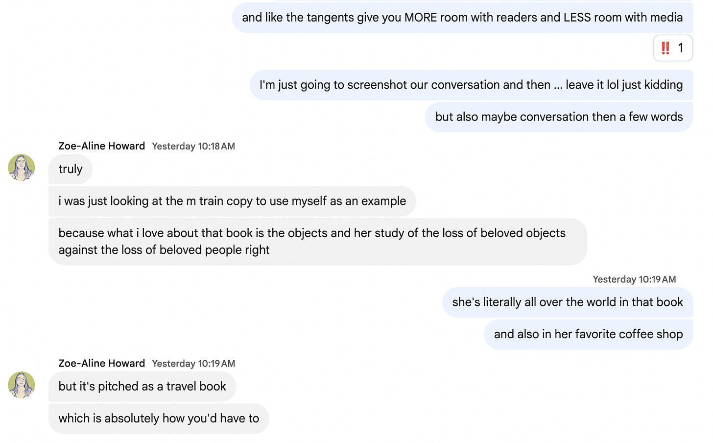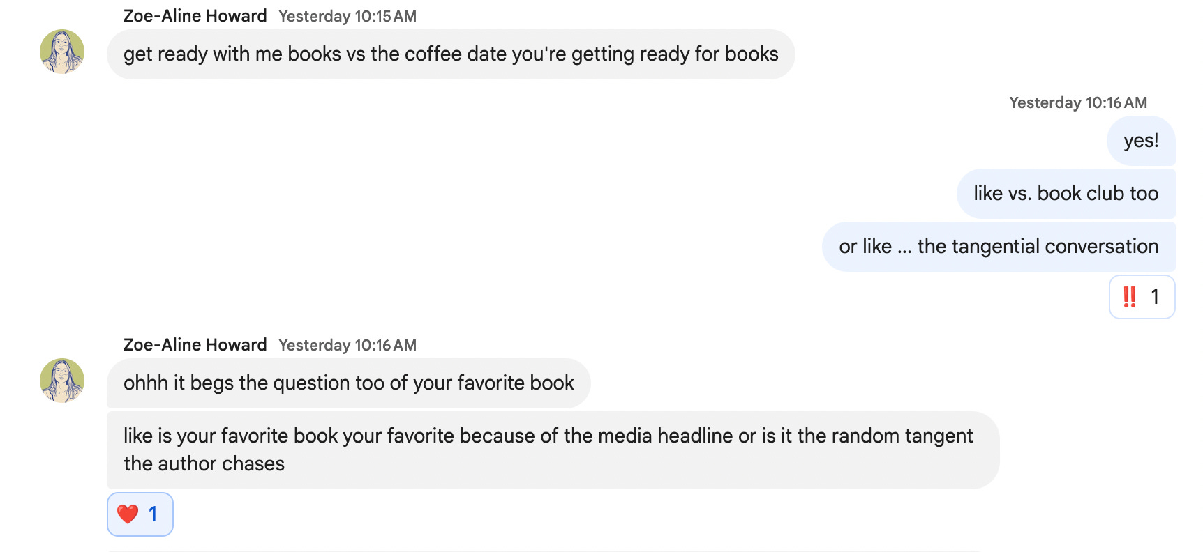 As Zoe puts it here: there’s the media headline (imagine it the length of a “get ready with me” video) and then there’s the actual book, which is you talking for an hour with your friends about what you’re writing at a coffee shop.