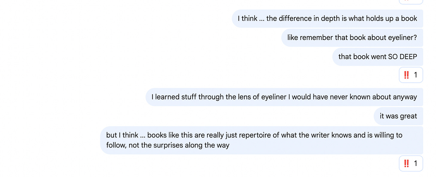 There’s a very popular book I’m seeing all over Substack (Zoe and I would pay money to see the proposal for this one), with an author that has a pretty large platform. So, perhaps platform sold the book. But as I got on my little complaint high horse in Google chat with Zoe and whined that I wasn’t sure what the book was ACTUALLY about even though I’ve seen it everywhere (and the cover everywhere with title + subtitle explaining it’s “aboutness”), I still am lost as to … the point?