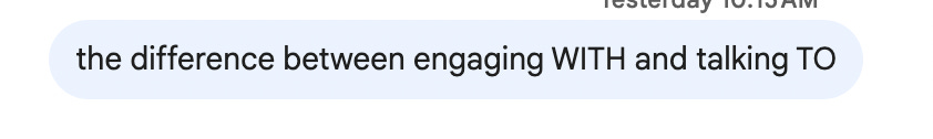 What we ultimately came to in our conversation about this, Zoe and I, is that the headline and the talking points and the get-ready-with-me are TALKING AT / (TO) people about the ideas in the book, and the book is about engaging WITH the ideas.